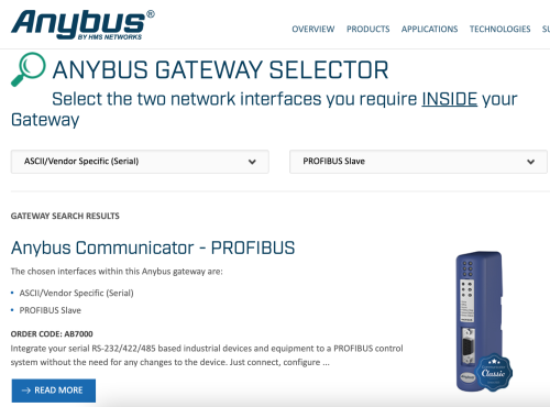 Představte si situaci, kdy potřebujete do stávající sítě profinet připojit čtečku čárového kódu se sériovým rozhraním RS-232. Čtečka funguje tak, že při každém úspěšném naskenování čárového kódu, tento kód odešle na seriový port. Potřebujeme tedy nakonfigurovat Anybus tak, aby čekal na seriovém portu na řetezec dat, jakmile tento řetězec dorazí tak z něj extrahovat data (naskenovaný kód) a poskytnout je na profibus rozhraní. Zároveň by měl nadřízenému systému dát vědět, že je k dispozici nově naskenovaný kód.