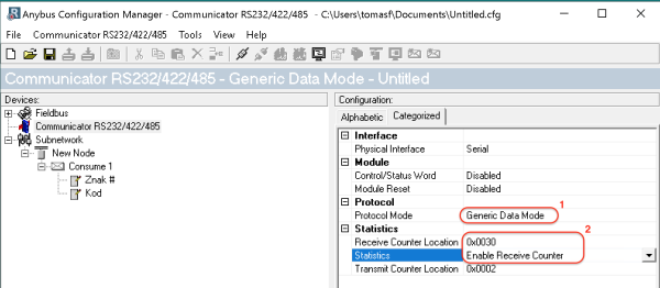 Pro náš případ tedy budeme potřebovat Anybus, který dokáže přenášet data ze sériového portu s obecnným ASCII protokolem na sběrnici profibus, kde bude v roli slave. Pomocí průvodce a zadáním potřebných rozhraní na obou stranách, získáme potřebný model Anybus.