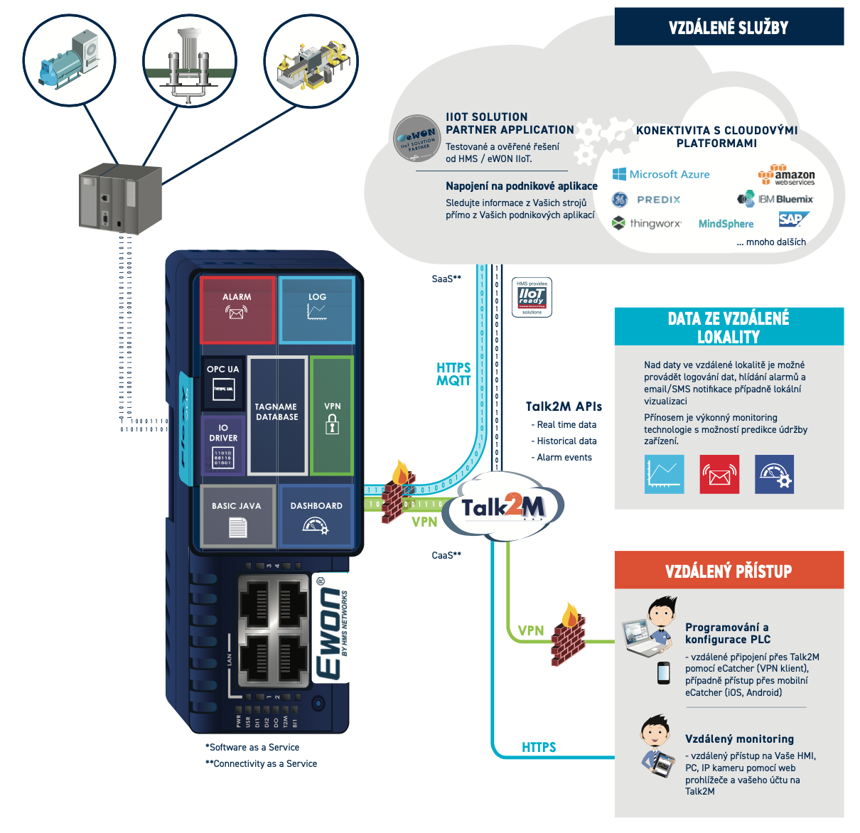 Typické zapojení zařízení do aplikace a princip činnosti je na obrázku níže. Pro vzdálenou komunikaci není vyžadováno speciální nastavení routerů v místě instalace. Komunikace probíhá na běžných TCP portech 443 nebo UDP 1194. Další možností komunikace s eWON Flexy je pomocí DataMailBoxu, HTTPS nebo MQTT protokolu.