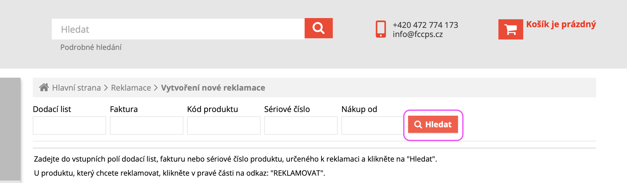 K tomu aby jste mohli zadat reklamaci přes e-shop tak musíte mít na tento e-shop registraci (uživatelské jméno a heslo). Pokud ještě nemáte logovací údaje a jste již naším zákazníkem, pak si můžete o něj jednorázově zažádat na info@fccps.cz.