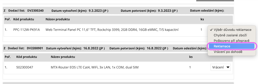 Jednotlivé řádky odpovídají jednotlivým zakázkám. V posledním sloupečku máme možnost vytvořit na daný produkt v zakázkce reklamaci.