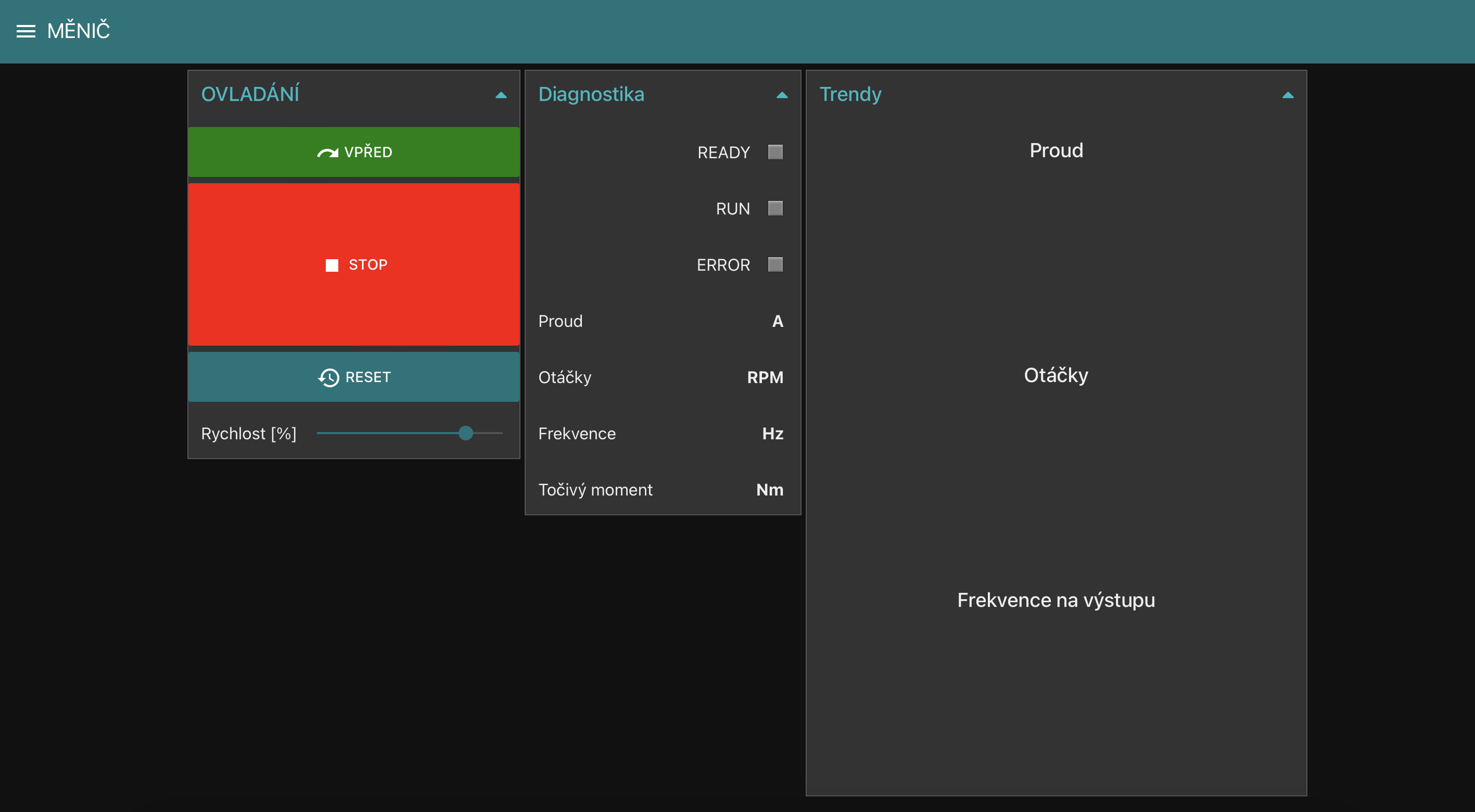Na tuto obrazovku se dostaneme pomocí menu v levé horní části obrazovky. Pro běžný provoz není potřeba pouze pro řešení problémů. Na obrazovce jsou informace o stavu měniče. Lze zde spustit motor (tlačítko VPŘED), zastavit motor (tlačítko STOP), restartovat měnič (tlačítko RESET), případně měnit aktuální rychlost motoru ( slider Rychlost). V prostřední části jsou informace o aktuálních otáčkách motoru, proudu, výstupní frekvenci z měniče a točivý moment aktivního motoru. V pravé časti obrazovky jsou trendy proudu, otáček a výstupní frekvenci.