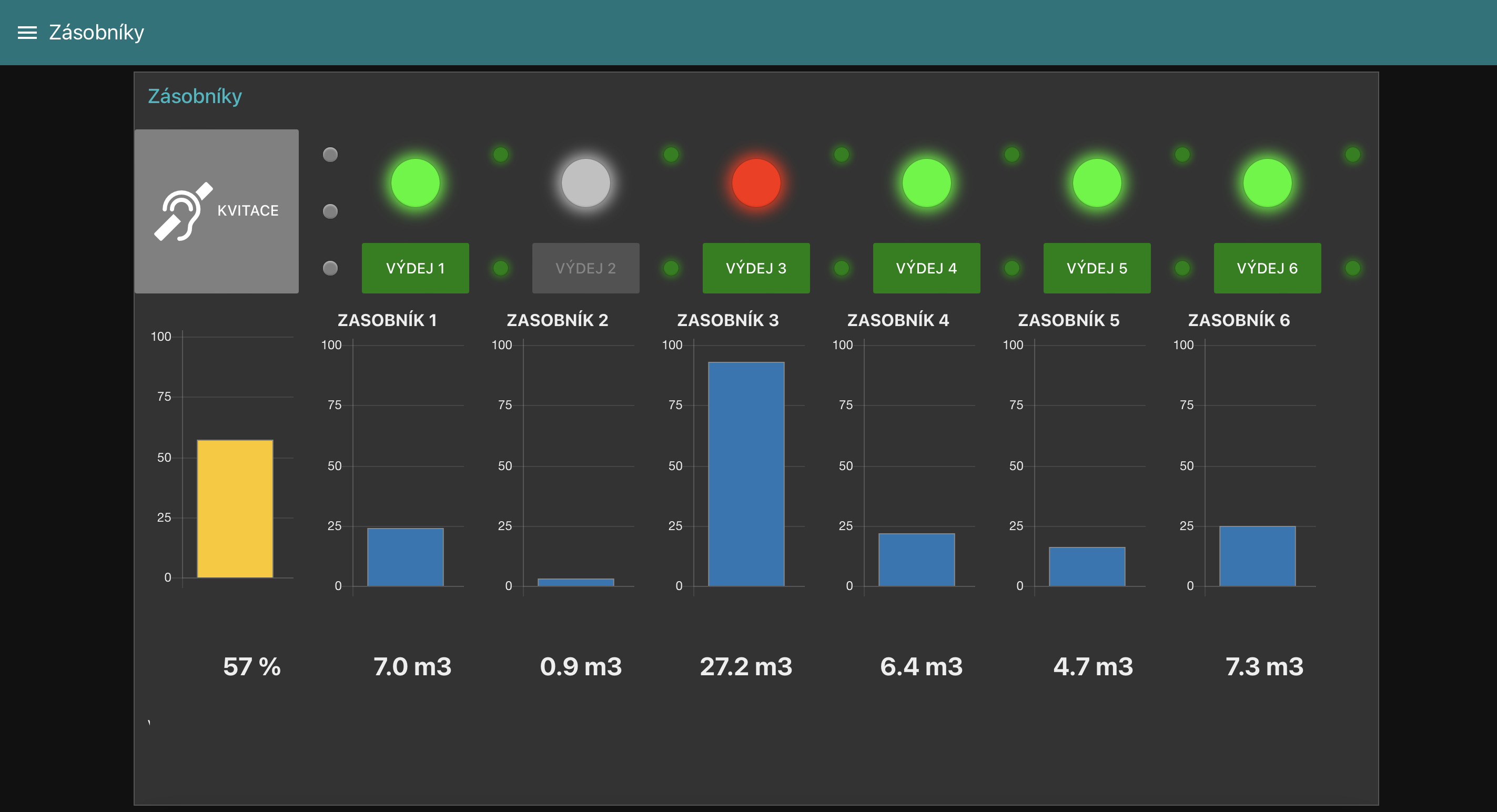 Pod každým modrým sloupcem se nachází číslo, které odpovídá aktuálnímu objemu v daném zásobníku [m3].