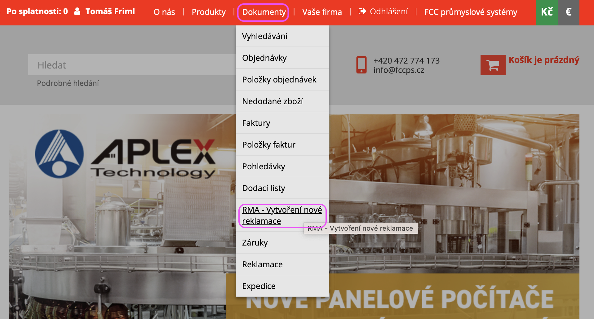Jakmile se na e-shop přihlásíte, tak reklamaci lze zadat volbou: Dokumenty → RMA-Vytvoření nové reklamace.
