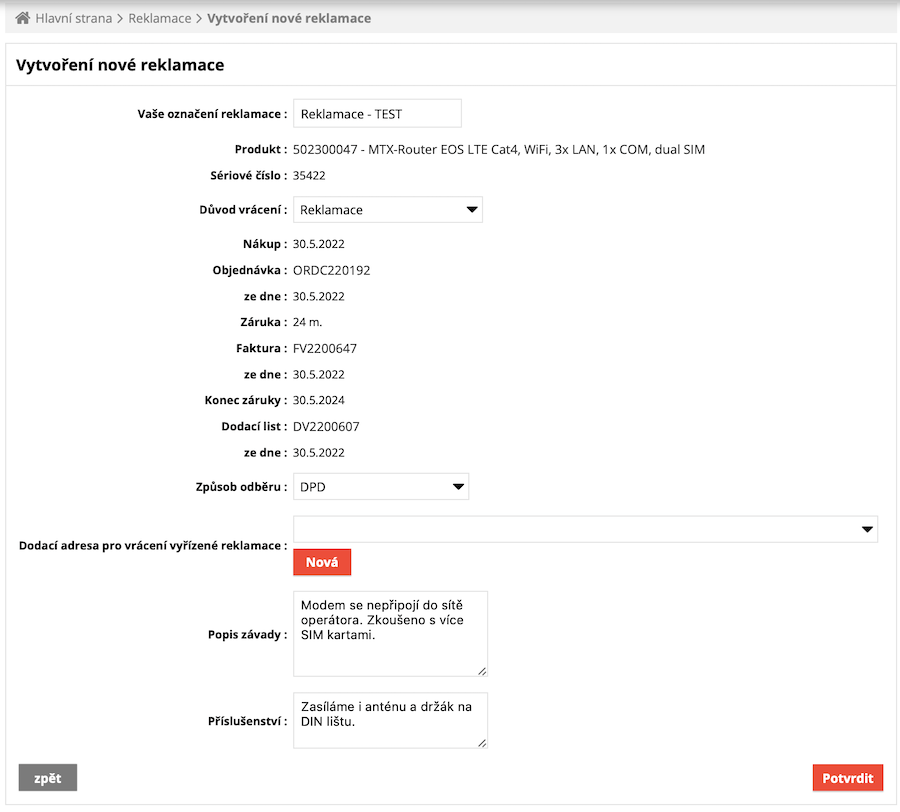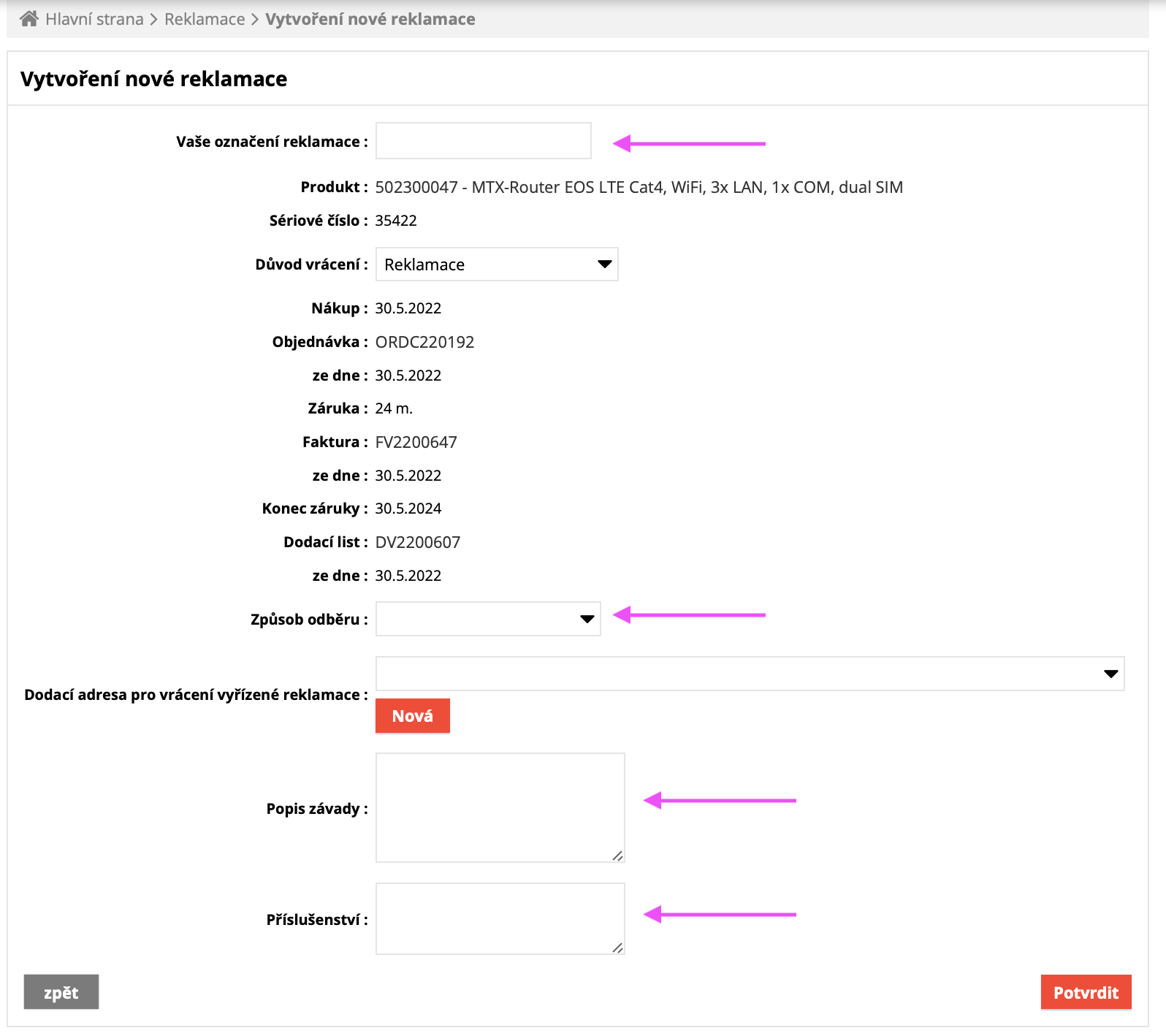 Ve vytvořené reklamaci je nutné vyplnit pár doplňujících údajů: